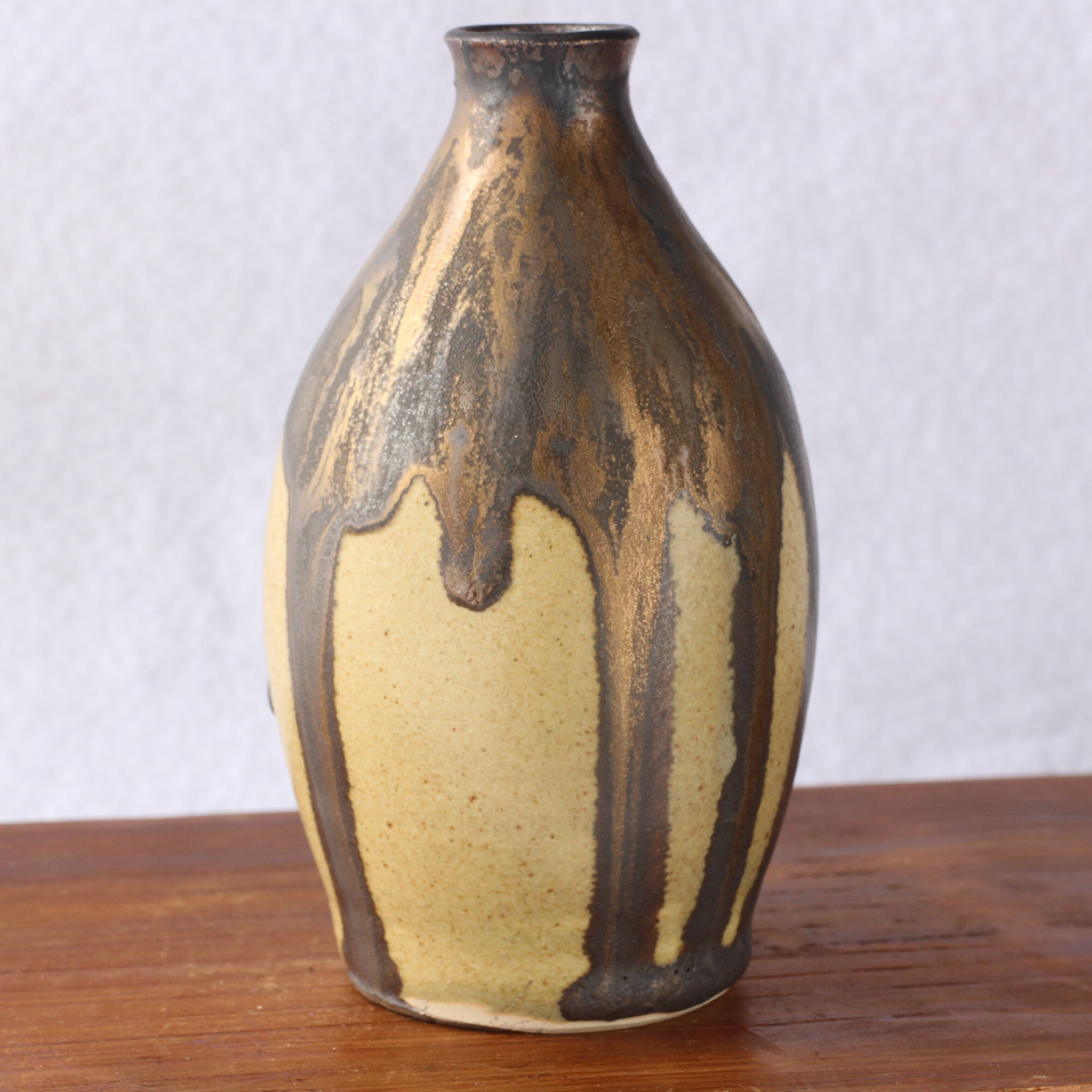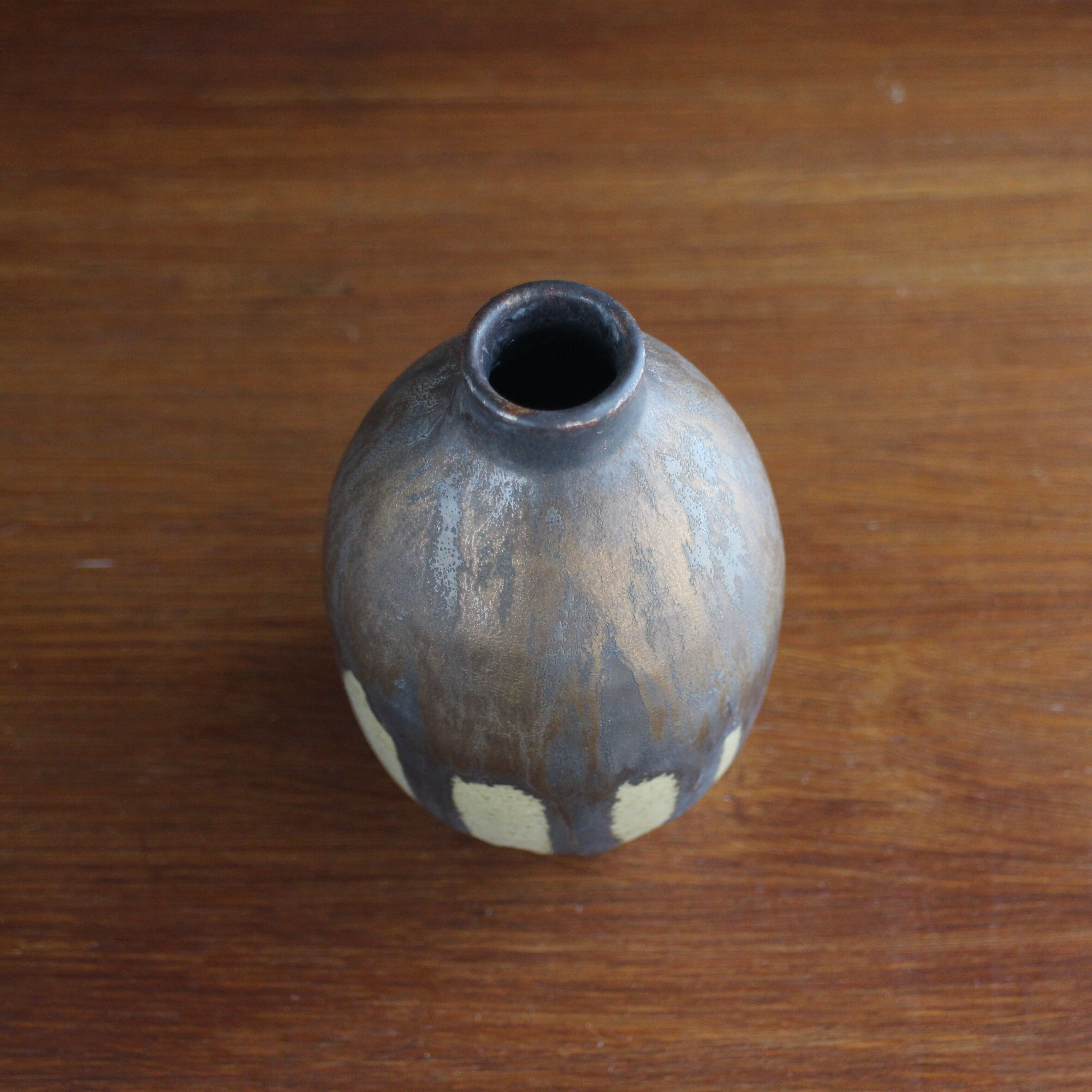 信楽粘土にブロンズ釉と下部に独自で調合した桑染釉をかけました。