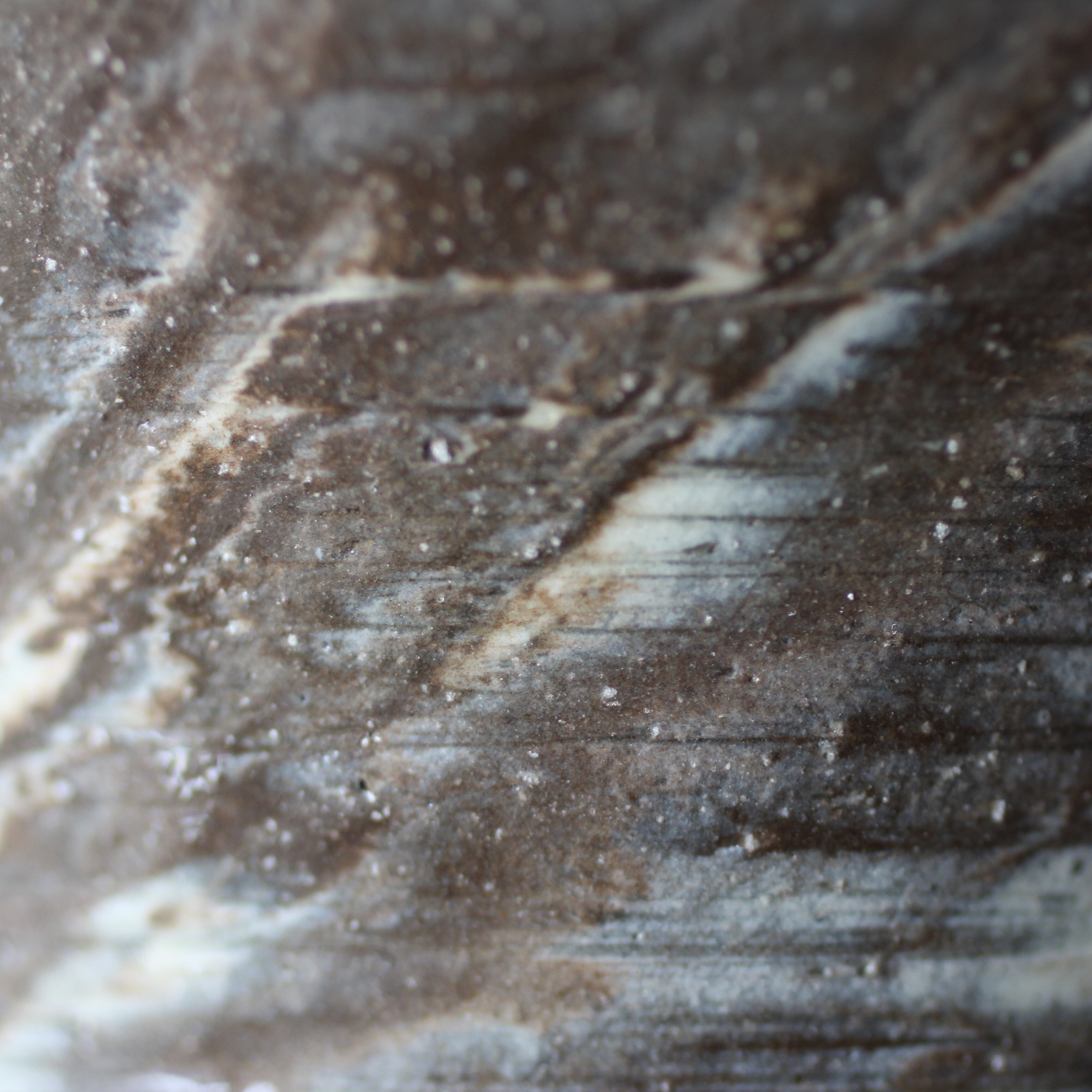 白色粘土(半磁器土)と黒土(黒泥)をろくろの上で練り合わせ、上から透明釉かけました。