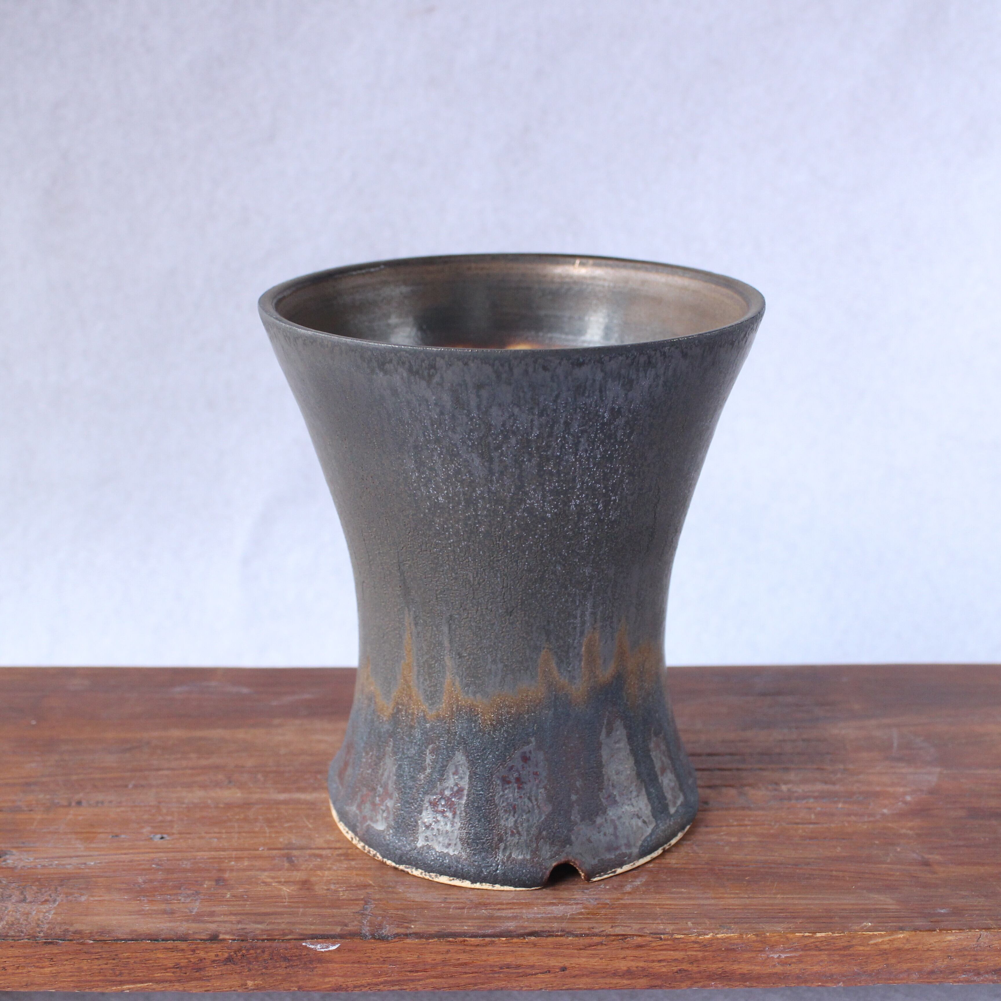 メタリック感のあるマンガン釉です。高台付近に金彩。