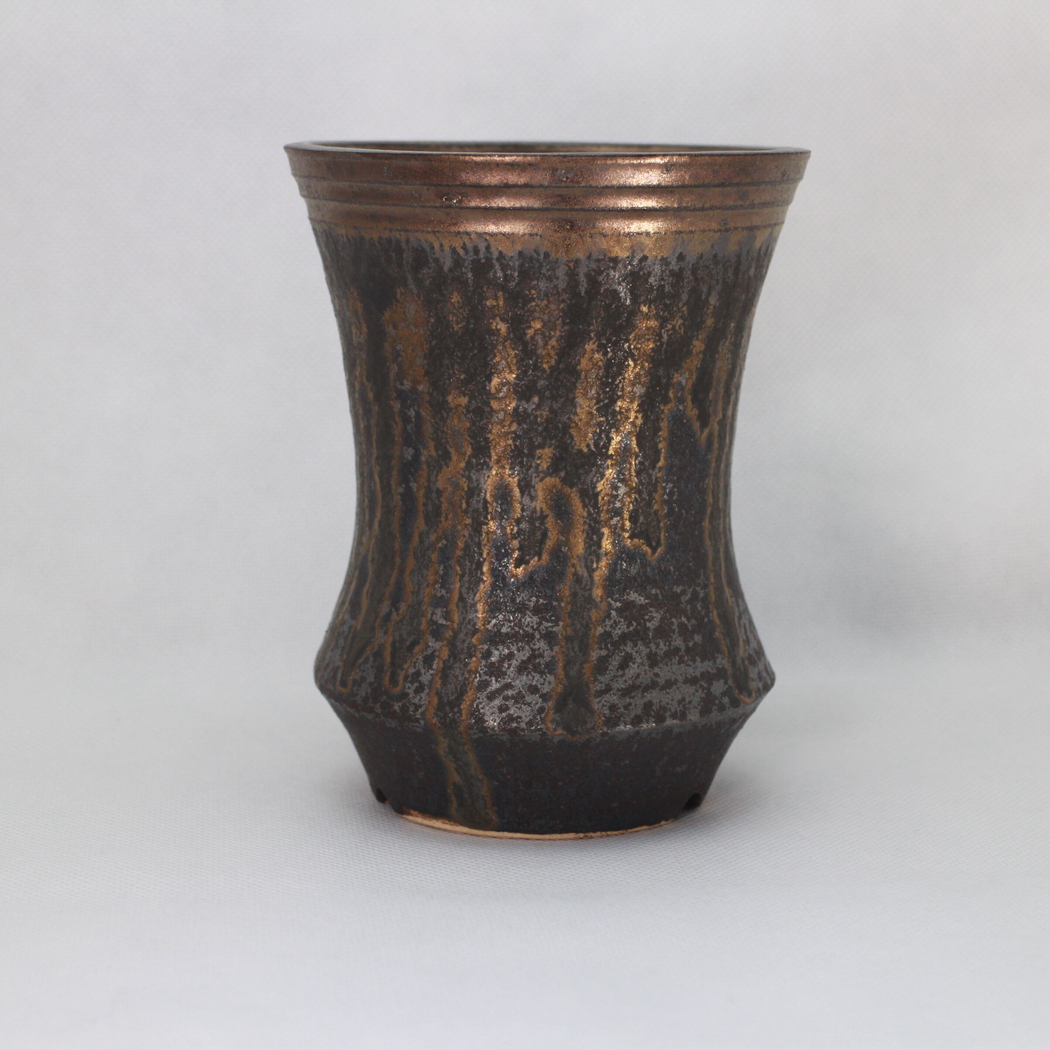 上部に金色が出る釉薬をスポイトで流してます。流れた跡(縁)に金色が出ます。