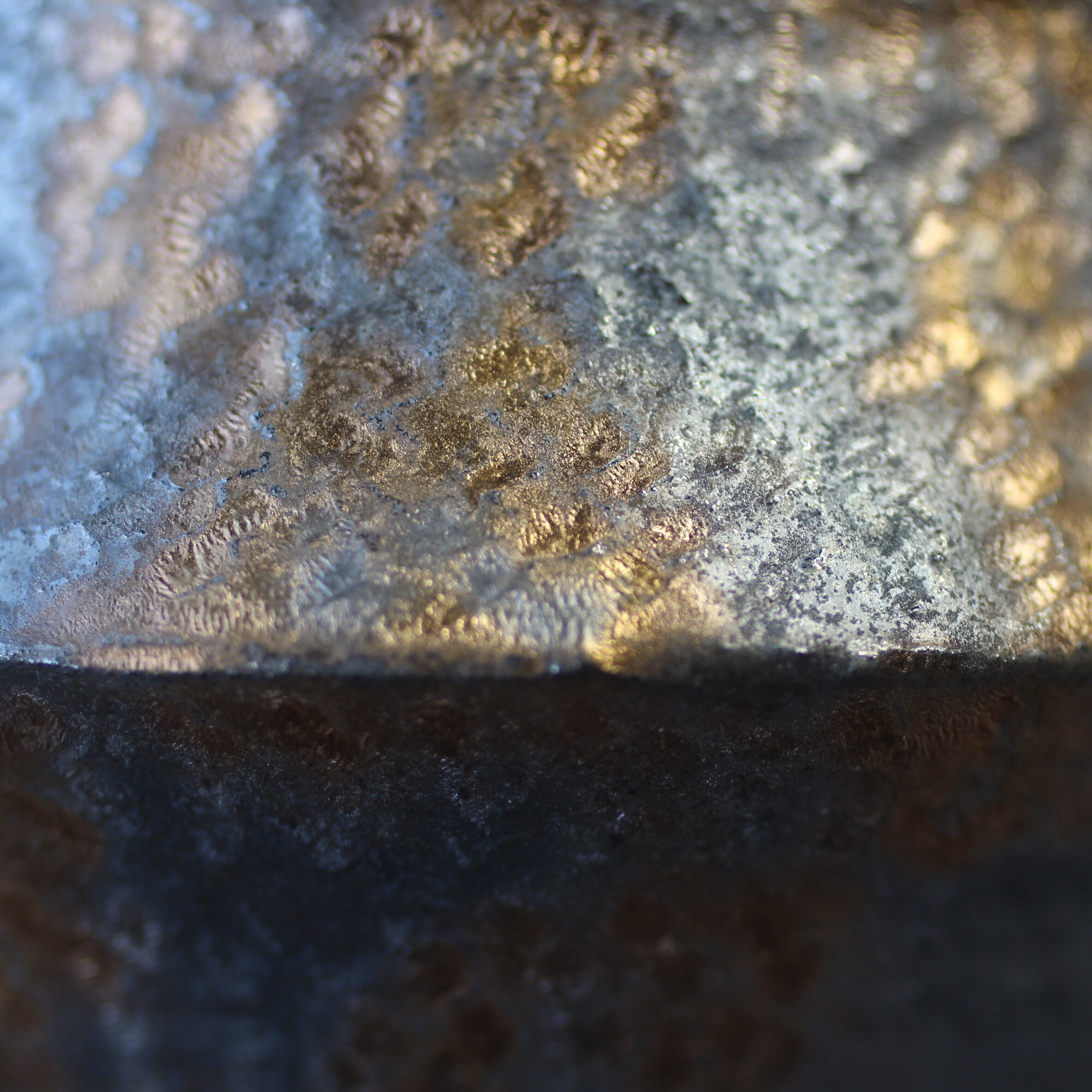 上部に金色が出る釉薬。下部は金色とガンメタリックの斑に施釉しています。