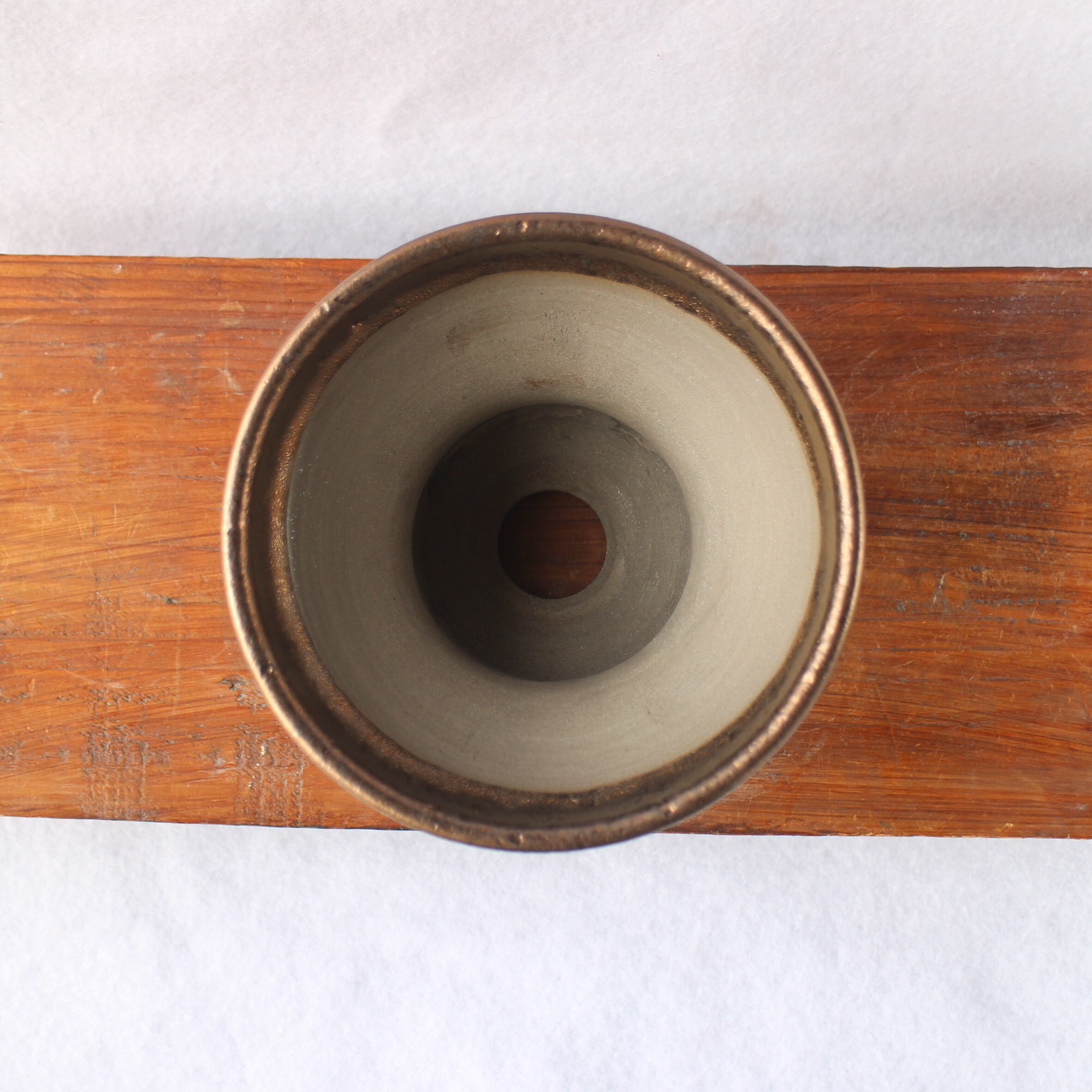 口縁に金彩。側面にリーフ模様を彫刻。下部はマンガン釉です。