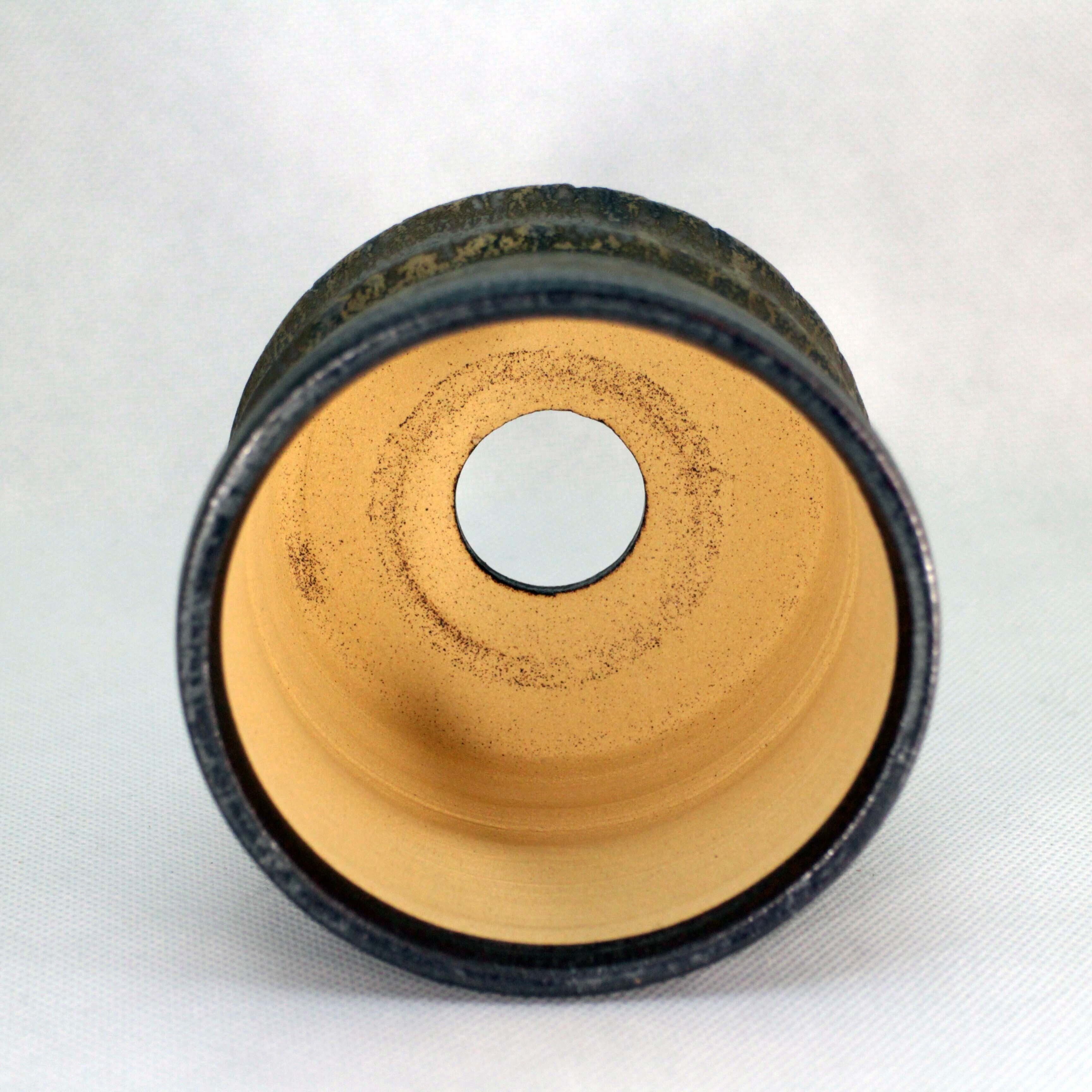 ろくろ挽くときに細めに挽き器表面をドライヤーであぶって乾燥させた後に膨らませることで表面に皹を入れています。
