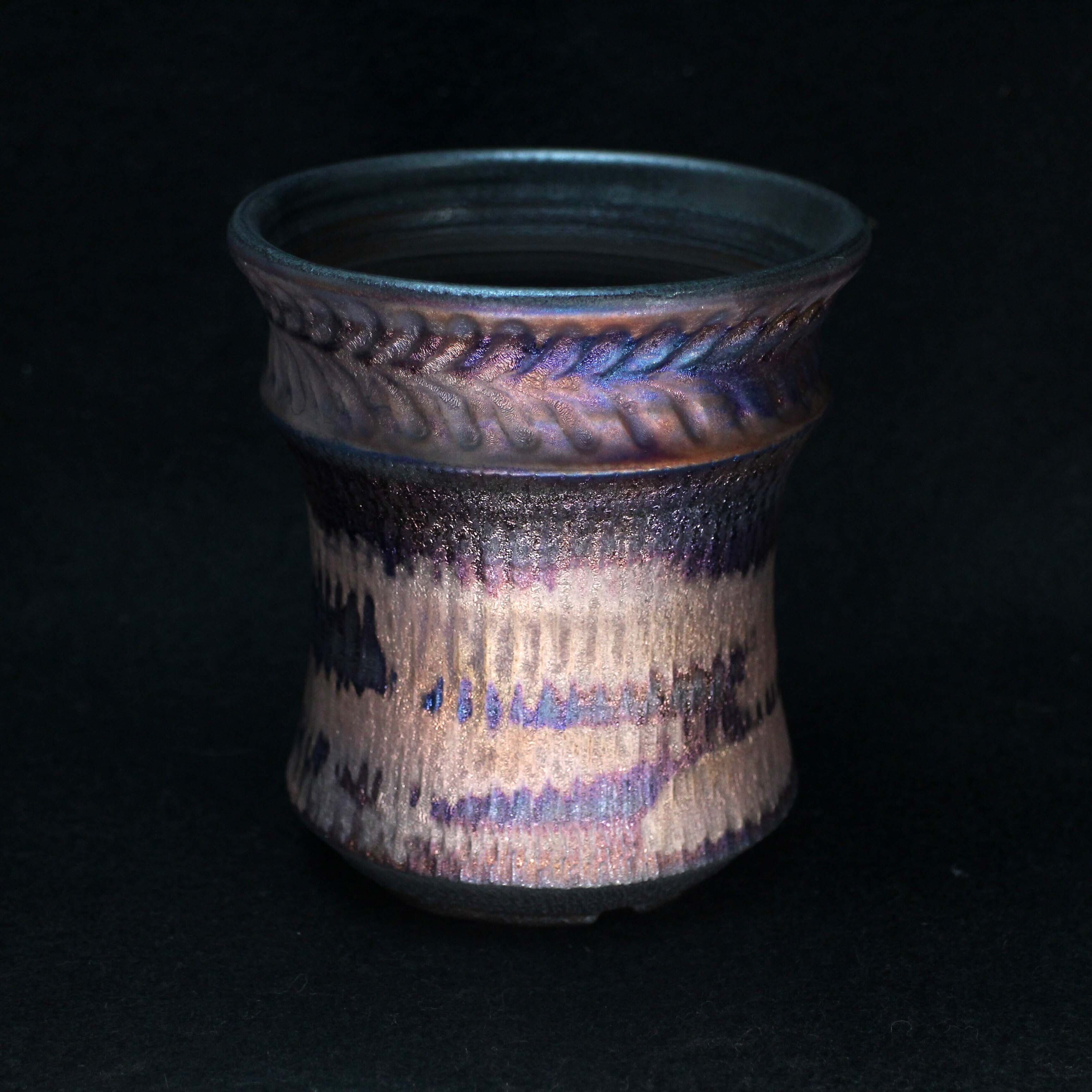 釉薬を筆塗りすることで厚さが変化し金色、紫色、青色を多彩な発色が複雑な景色を醸し出しています